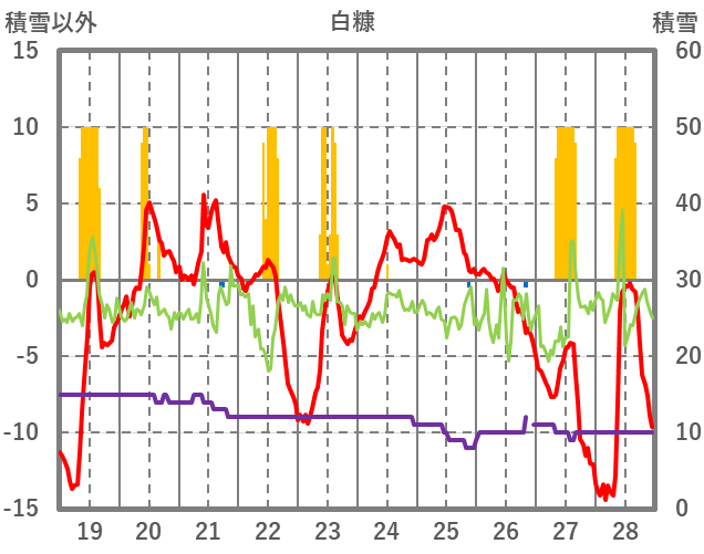 | 日 | 時 | 気温 | 降水 | 風向/風速 | 日照 | 積雪 | 降雪 |