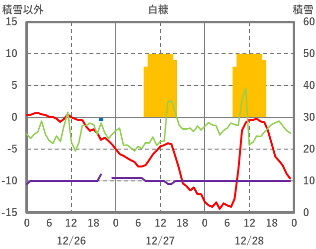 | 日 | 時 | 気温 | 降水 | 風向/風速 | 日照 | 積雪 | 降雪 |