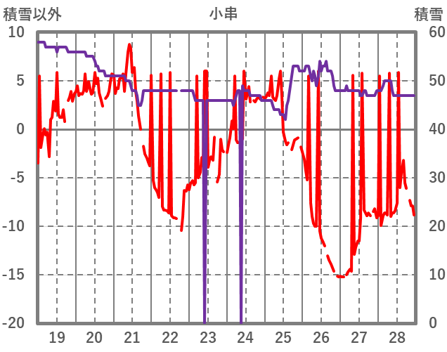 | 日 | 時 | 気温 | 降水 | 風向/風速 | 日照 | 積雪 | 降雪 |