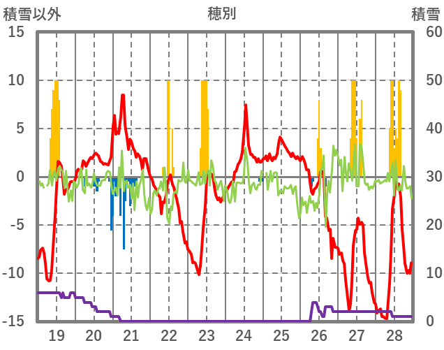 | 日 | 時 | 気温 | 降水 | 風向/風速 | 日照 | 積雪 | 降雪 |