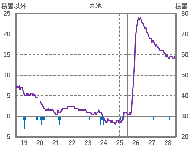 | 日 | 時 | 気温 | 降水 | 風向/風速 | 日照 | 積雪 | 降雪 |