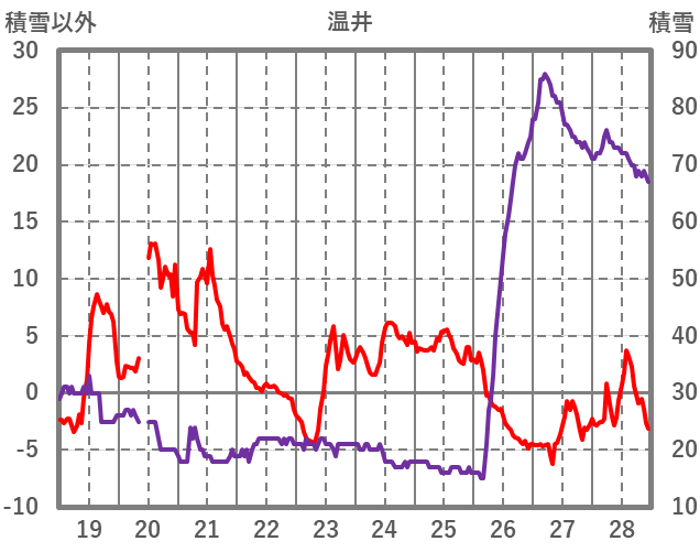 | 日 | 時 | 気温 | 降水 | 風向/風速 | 日照 | 積雪 | 降雪 |