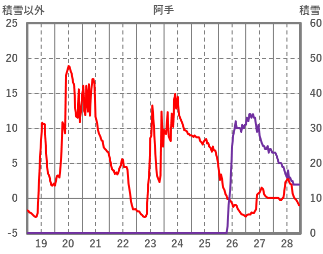 | 日 | 時 | 気温 | 降水 | 風向/風速 | 日照 | 積雪 | 降雪 |