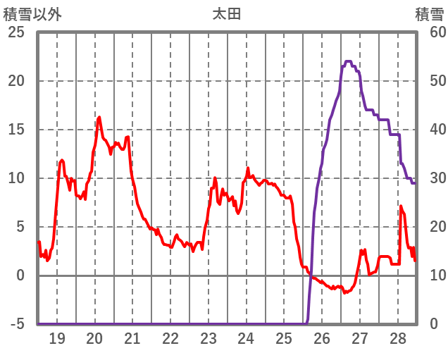 | 日 | 時 | 気温 | 降水 | 風向/風速 | 日照 | 積雪 | 降雪 |