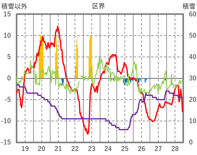 | 日 | 時 | 気温 | 降水 | 風向/風速 | 日照 | 積雪 | 降雪 |