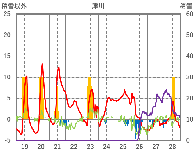 | 日 | 時 | 気温 | 降水 | 風向/風速 | 日照 | 積雪 | 降雪 |