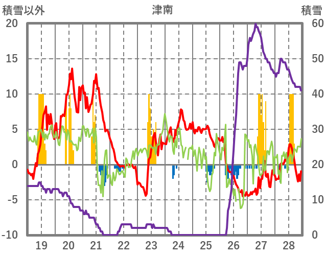 | 日 | 時 | 気温 | 降水 | 風向/風速 | 日照 | 積雪 | 降雪 |