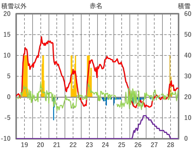 | 日 | 時 | 気温 | 降水 | 風向/風速 | 日照 | 積雪 | 降雪 |