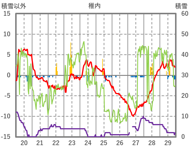 | 日 | 時 | 気温 | 降水 | 風向/風速 | 日照 | 積雪 | 降雪 |