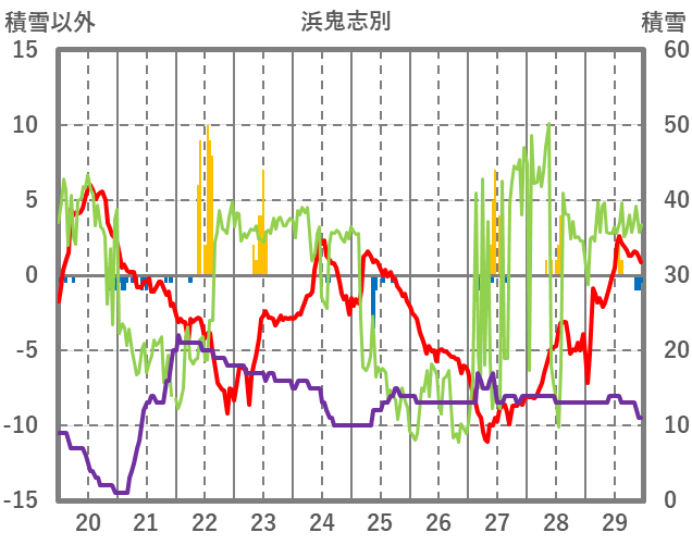 | 日 | 時 | 気温 | 降水 | 風向/風速 | 日照 | 積雪 | 降雪 |