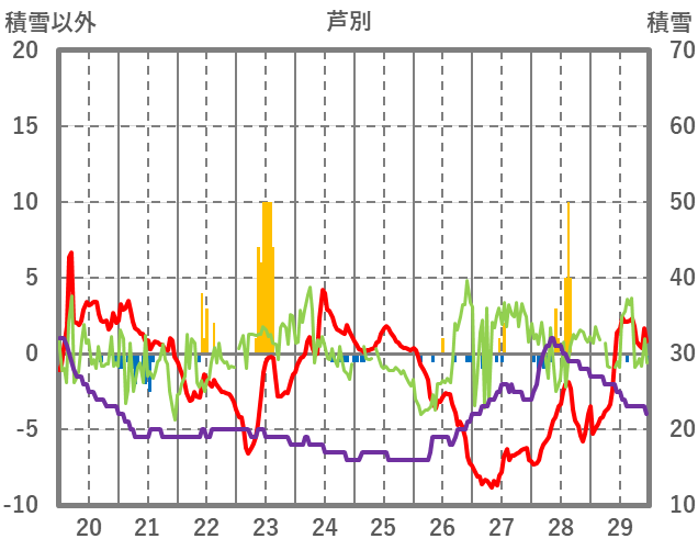 | 日 | 時 | 気温 | 降水 | 風向/風速 | 日照 | 積雪 | 降雪 |