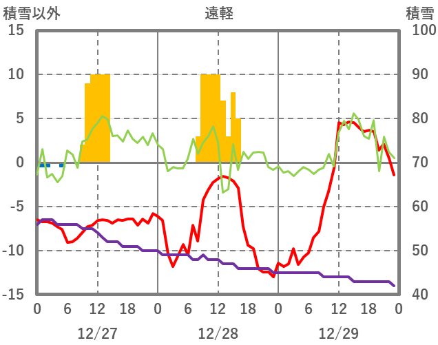 | 日 | 時 | 気温 | 降水 | 風向/風速 | 日照 | 積雪 | 降雪 |
