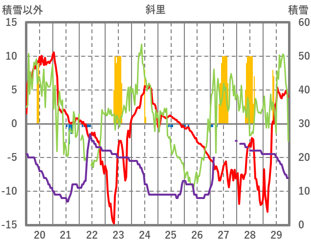 | 日 | 時 | 気温 | 降水 | 風向/風速 | 日照 | 積雪 | 降雪 |