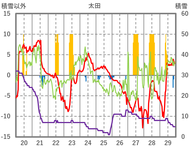 | 日 | 時 | 気温 | 降水 | 風向/風速 | 日照 | 積雪 | 降雪 |