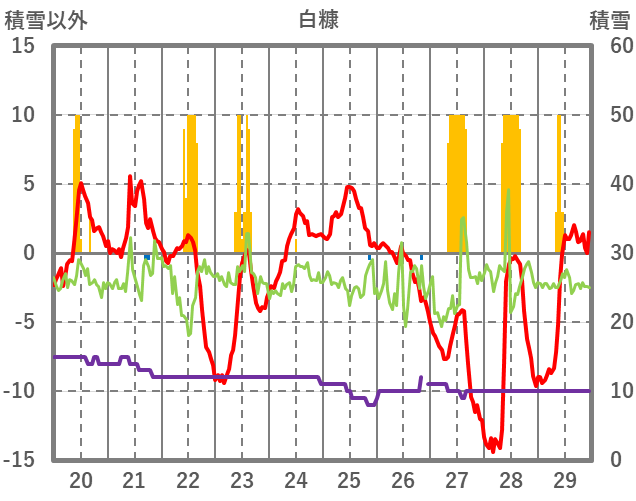 | 日 | 時 | 気温 | 降水 | 風向/風速 | 日照 | 積雪 | 降雪 |