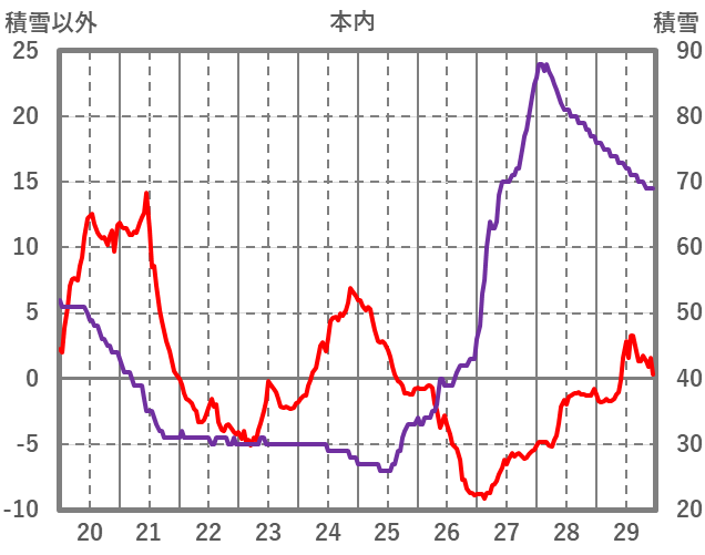 | 日 | 時 | 気温 | 降水 | 風向/風速 | 日照 | 積雪 | 降雪 |