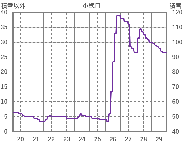 | 日 | 時 | 気温 | 降水 | 風向/風速 | 日照 | 積雪 | 降雪 |