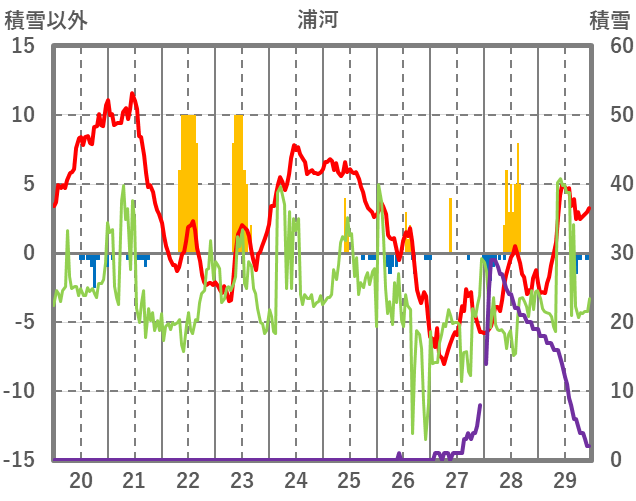 | 日 | 時 | 気温 | 降水 | 風向/風速 | 日照 | 積雪 | 降雪 |