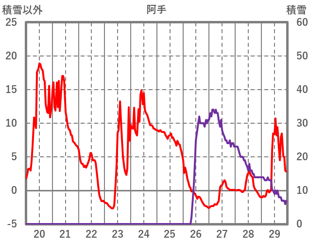 | 日 | 時 | 気温 | 降水 | 風向/風速 | 日照 | 積雪 | 降雪 |