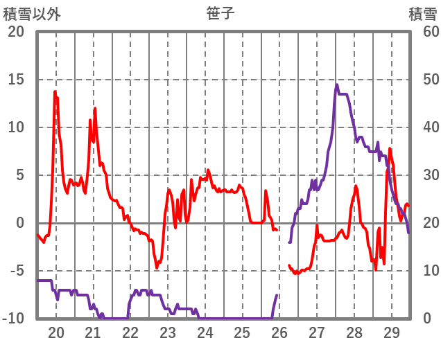 | 日 | 時 | 気温 | 降水 | 風向/風速 | 日照 | 積雪 | 降雪 |