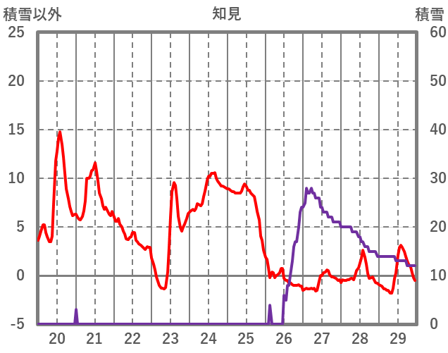 | 日 | 時 | 気温 | 降水 | 風向/風速 | 日照 | 積雪 | 降雪 |