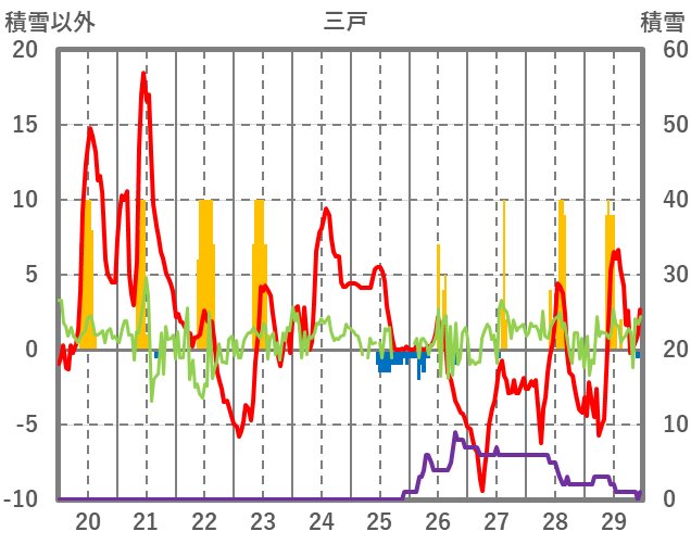 | 日 | 時 | 気温 | 降水 | 風向/風速 | 日照 | 積雪 | 降雪 |