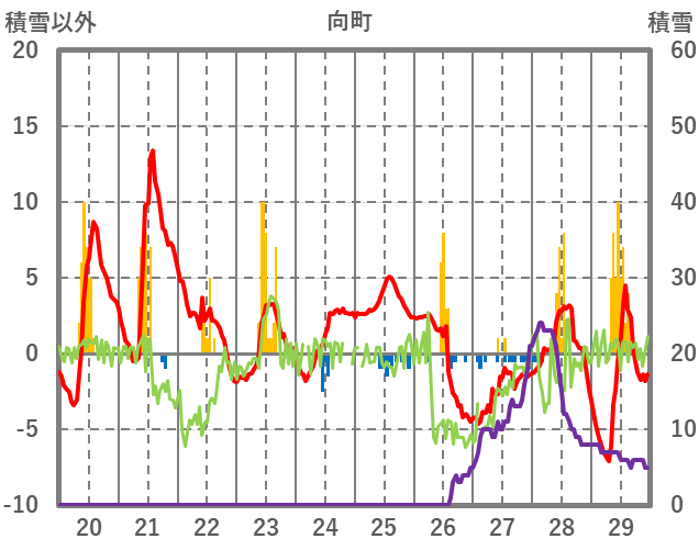 | 日 | 時 | 気温 | 降水 | 風向/風速 | 日照 | 積雪 | 降雪 |