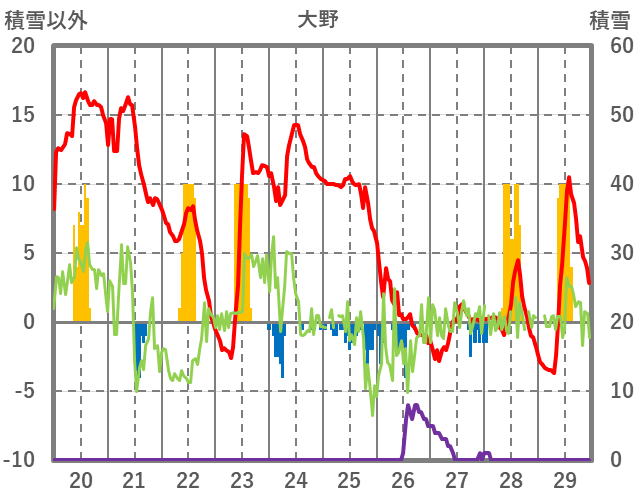 | 日 | 時 | 気温 | 降水 | 風向/風速 | 日照 | 積雪 | 降雪 |