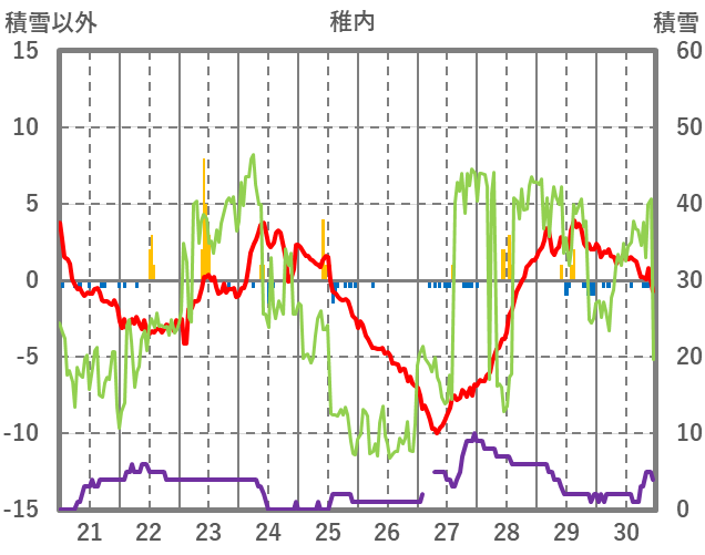 | 日 | 時 | 気温 | 降水 | 風向/風速 | 日照 | 積雪 | 降雪 |