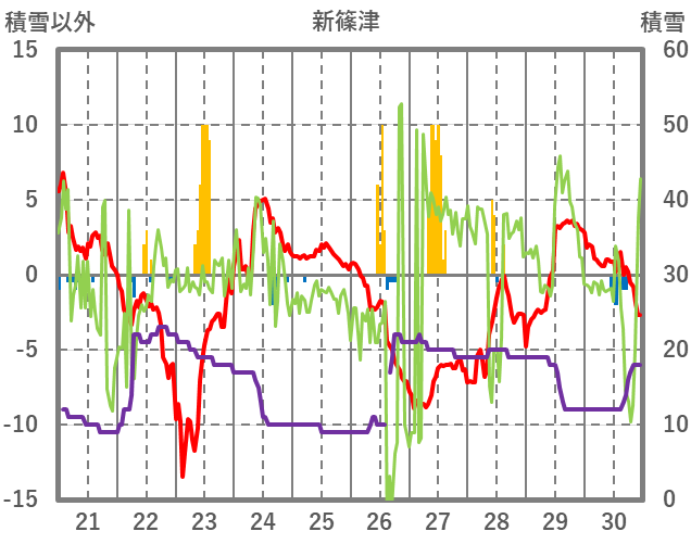 | 日 | 時 | 気温 | 降水 | 風向/風速 | 日照 | 積雪 | 降雪 |