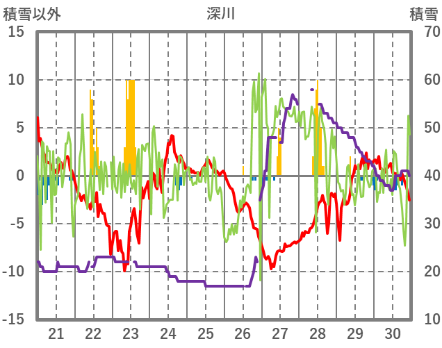 | 日 | 時 | 気温 | 降水 | 風向/風速 | 日照 | 積雪 | 降雪 |