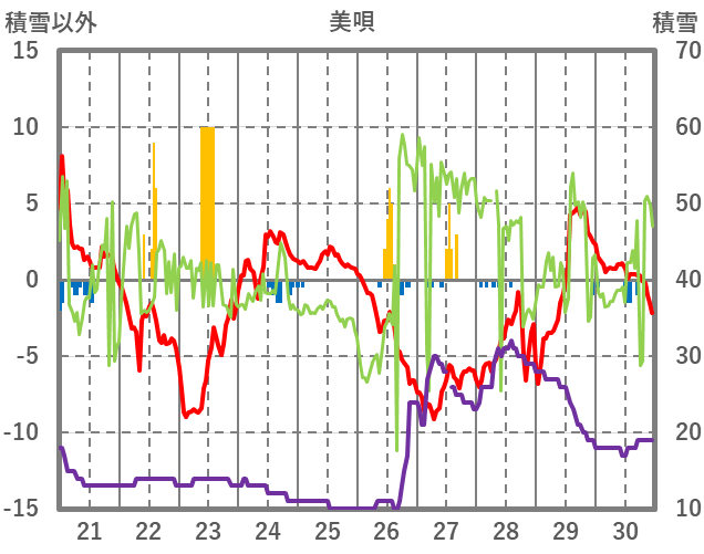 | 日 | 時 | 気温 | 降水 | 風向/風速 | 日照 | 積雪 | 降雪 |