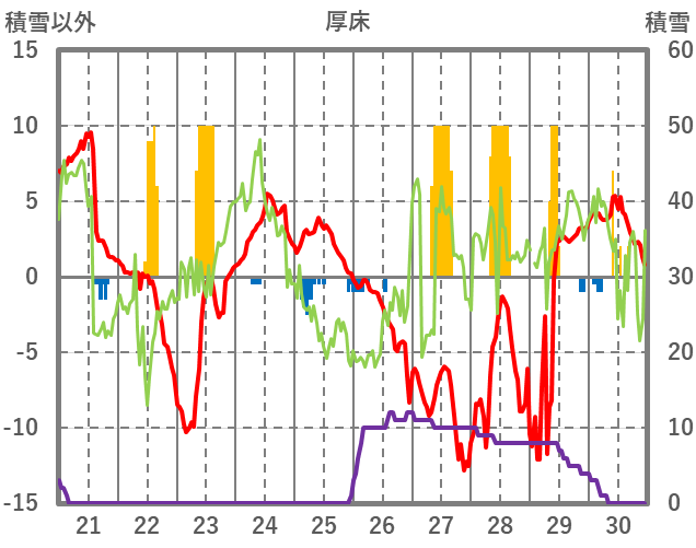 | 日 | 時 | 気温 | 降水 | 風向/風速 | 日照 | 積雪 | 降雪 |