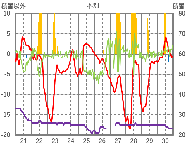 | 日 | 時 | 気温 | 降水 | 風向/風速 | 日照 | 積雪 | 降雪 |