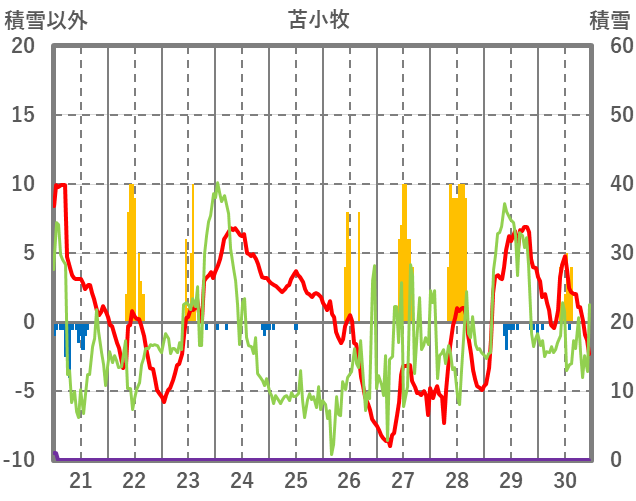 | 日 | 時 | 気温 | 降水 | 風向/風速 | 日照 | 積雪 | 降雪 |
