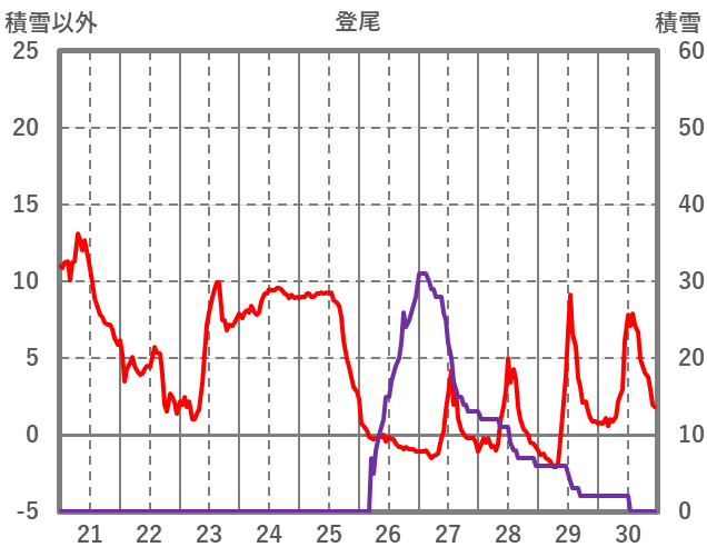 | 日 | 時 | 気温 | 降水 | 風向/風速 | 日照 | 積雪 | 降雪 |