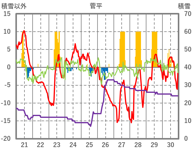 | 日 | 時 | 気温 | 降水 | 風向/風速 | 日照 | 積雪 | 降雪 |
