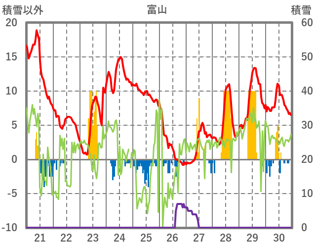 | 日 | 時 | 気温 | 降水 | 風向/風速 | 日照 | 積雪 | 降雪 |
