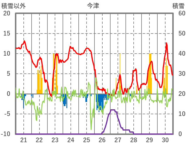 | 日 | 時 | 気温 | 降水 | 風向/風速 | 日照 | 積雪 | 降雪 |