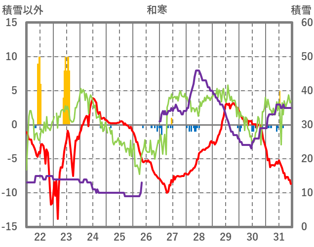 | 日 | 時 | 気温 | 降水 | 風向/風速 | 日照 | 積雪 | 降雪 |