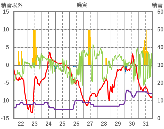 | 日 | 時 | 気温 | 降水 | 風向/風速 | 日照 | 積雪 | 降雪 |