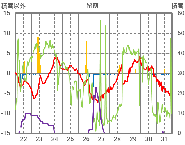 | 日 | 時 | 気温 | 降水 | 風向/風速 | 日照 | 積雪 | 降雪 |