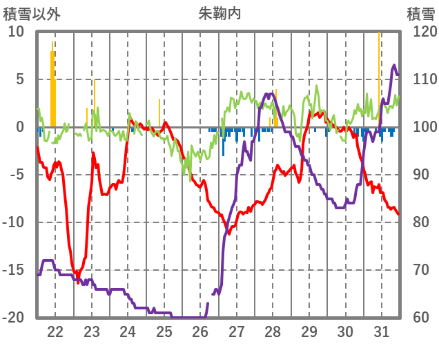 | 日 | 時 | 気温 | 降水 | 風向/風速 | 日照 | 積雪 | 降雪 |