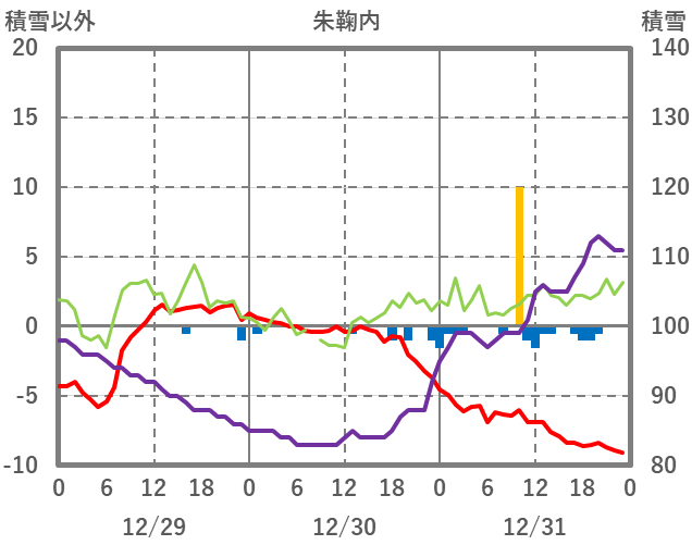 | 日 | 時 | 気温 | 降水 | 風向/風速 | 日照 | 積雪 | 降雪 |