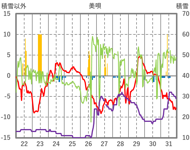 | 日 | 時 | 気温 | 降水 | 風向/風速 | 日照 | 積雪 | 降雪 |
