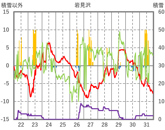| 日 | 時 | 気温 | 降水 | 風向/風速 | 日照 | 積雪 | 降雪 |