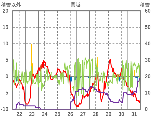 | 日 | 時 | 気温 | 降水 | 風向/風速 | 日照 | 積雪 | 降雪 |