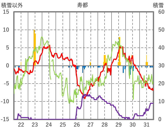 | 日 | 時 | 気温 | 降水 | 風向/風速 | 日照 | 積雪 | 降雪 |