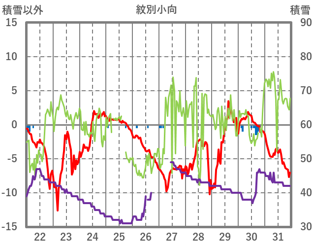 | 日 | 時 | 気温 | 降水 | 風向/風速 | 日照 | 積雪 | 降雪 |