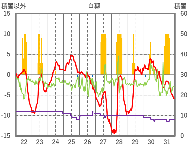 | 日 | 時 | 気温 | 降水 | 風向/風速 | 日照 | 積雪 | 降雪 |